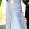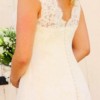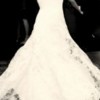 This elegant, couture, wedding dress by Phillipa Lepley has an internal corset and a train length of 64 inches and is made of silk crepe with an intricate, French lace, overlay. The neck line and arm holes are shaped by lace rose border scallops and the neck line is square at the front and v shaped at the back. The dress is fully lined with silk and can be buttoned up for dancing. The dress has been professionally dry cleaned by Jeeves of Belgravia and is in perfect condition.