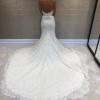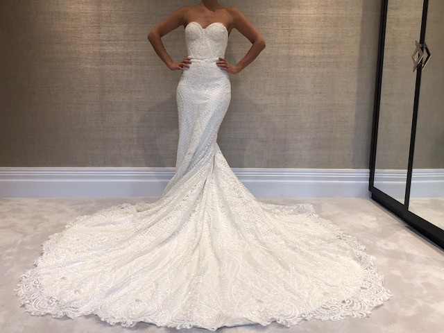 The dress is fitted to create the perfect hourglass figure, with a flattering sweetheart neckline. There is a long, round train to the back of the dress, kicking out from the knee accentuate the hourglass silhouette, and will give a truly show stopping impression as you walk down the isle.