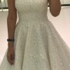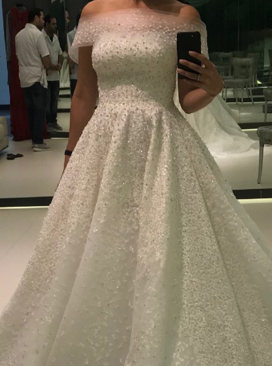 It has shimmery embroidery all over, and has an off-shoulder piece that can be removed to make the dress strapless, so it has two different looks. One look is off the shoulder and the other look is strapless