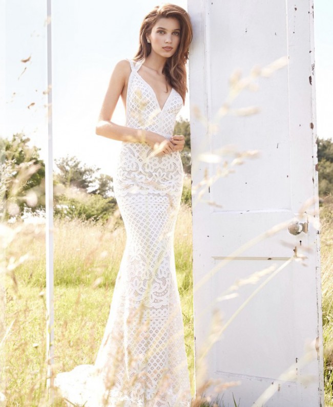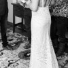 Ivory Guipure banded lace trumpet, plunging halter neck line with Venice lace strap detail, low back and sweep train.