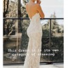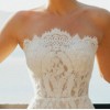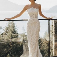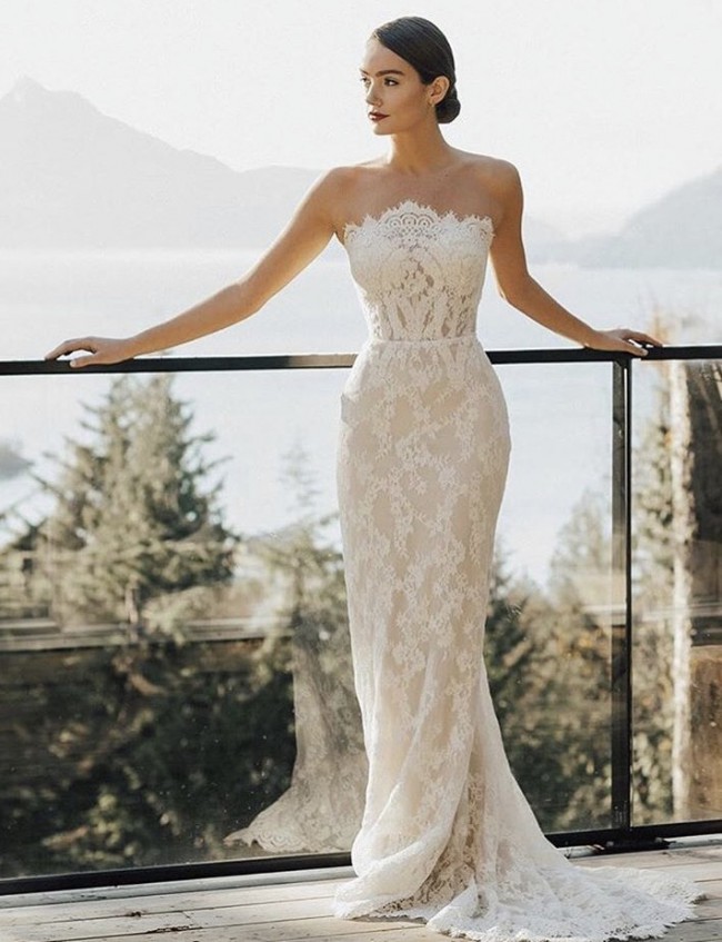 I love the top of it. I like the column and I just love the lace. It feels kind of like it could be vintage. The scalloped-edge dress also featured built-in caging (like the boning of a corset), which will keep the strapless top secure. It’s so delicate and beautiful, you need to appreciated the reverse neckline.