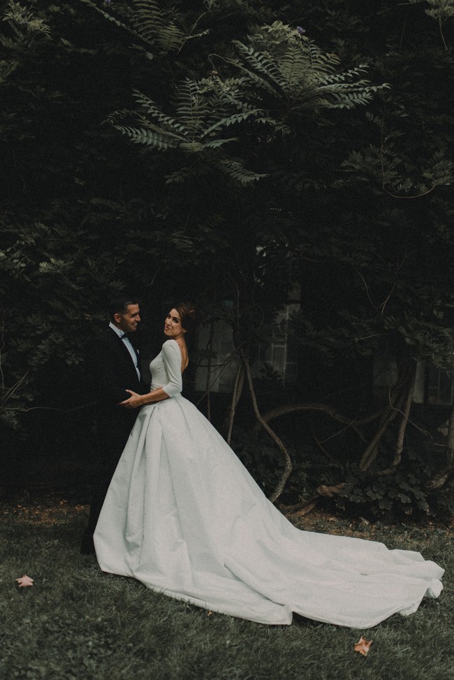 The top and the sleeves are made of georgette. The white skirt with the train is in mat tafetta. The underskirt in antique pink has three tulle layers upon each other.