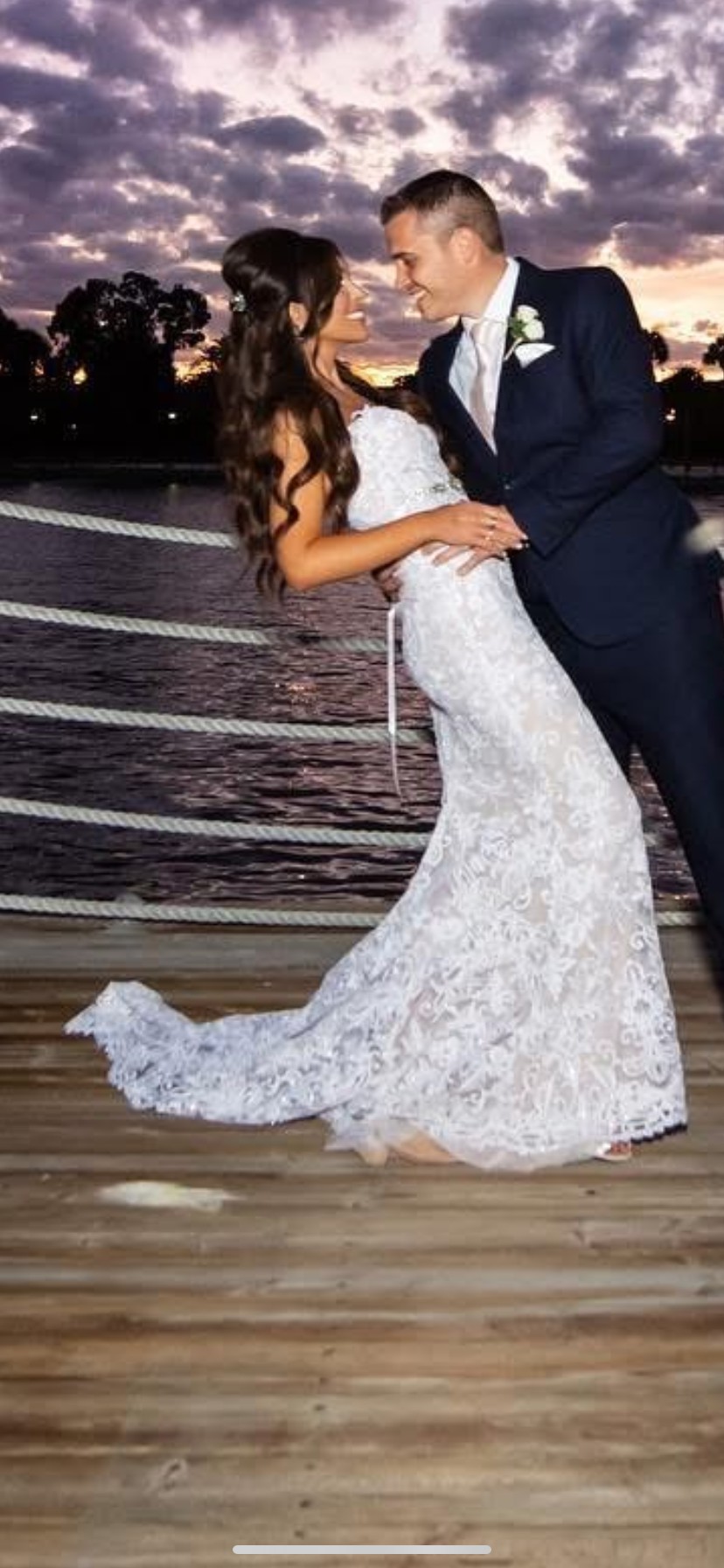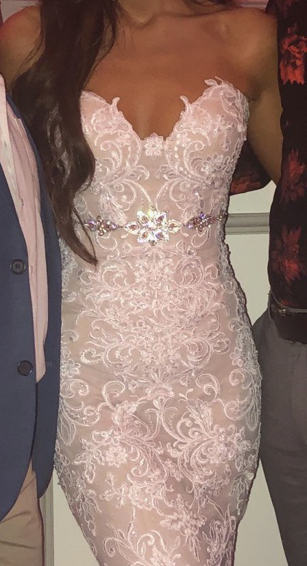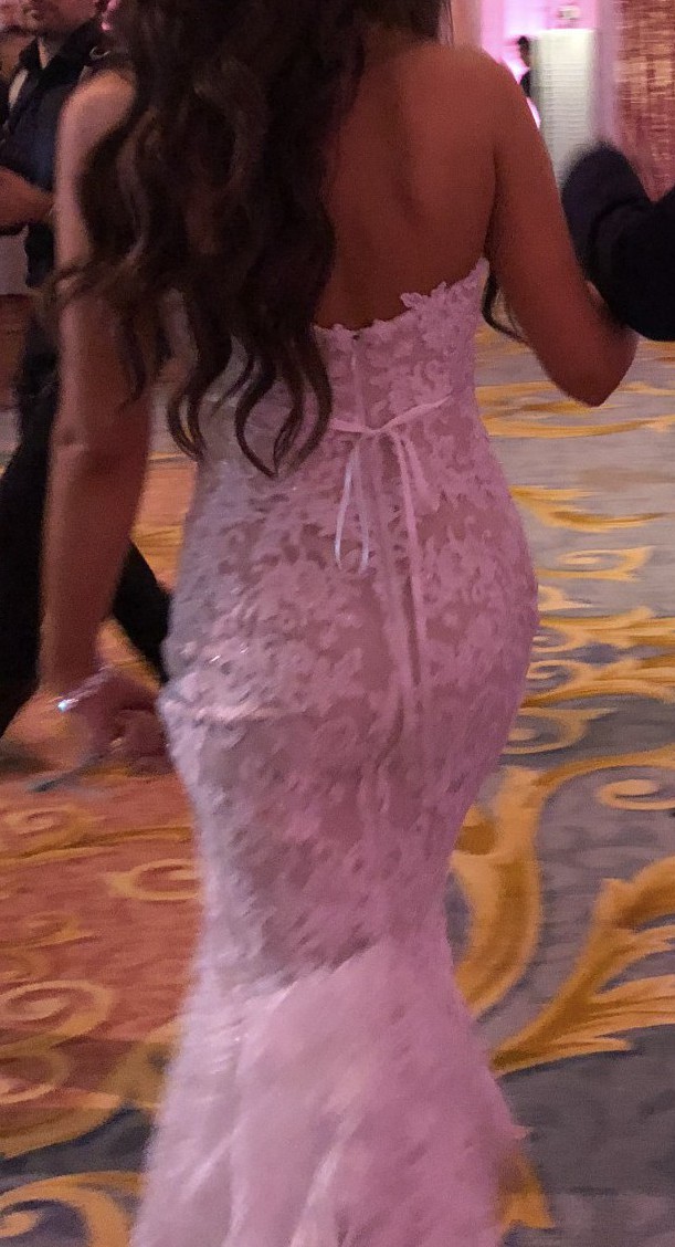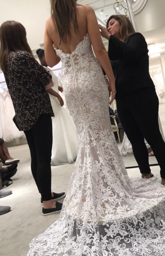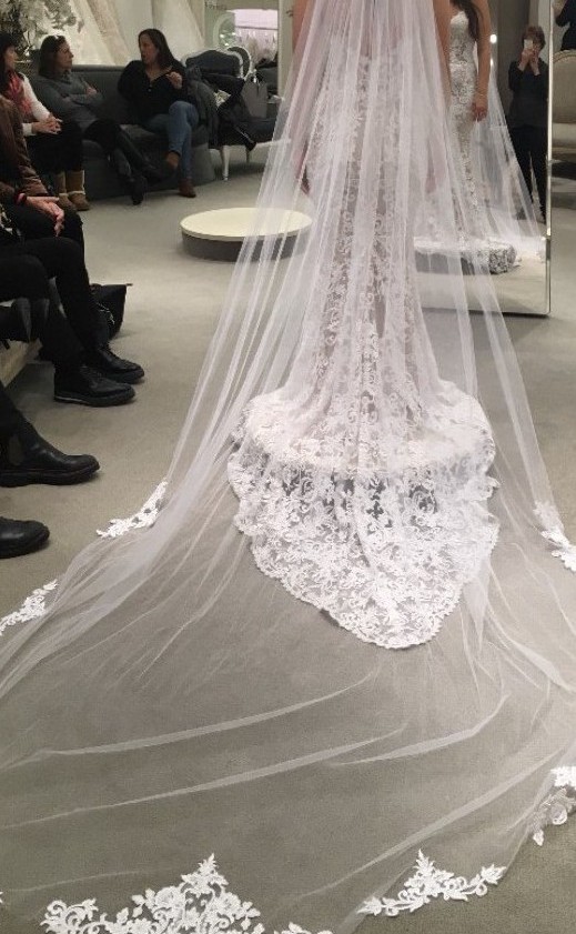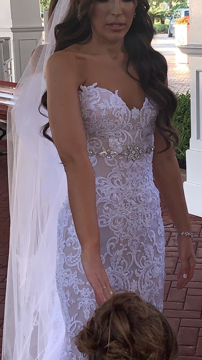 This is a Pnina Tornai dress 4576. The original dress was long sleeves and sheer. She made it sleeveless for me. There is a long train. Also, the belt on it can be removed if you want - it is also sewn on the sides in case you want to leave it. There is a tie in the back for the belt which makes a cute detail. I am 5'7"- you can always have it shortened so it will be perfect for any height. Also selling the veil which is a dramatic veil train with matching lace detail on it (goes with the dress). Comes with bustle. Both the dress and veil were dry cleaned and spotless! Original cost is $12,500 for dress and $2,500 for the veil. Selling it all together. If you want just one or the other - please email me to inquire about cost! Thank you!