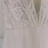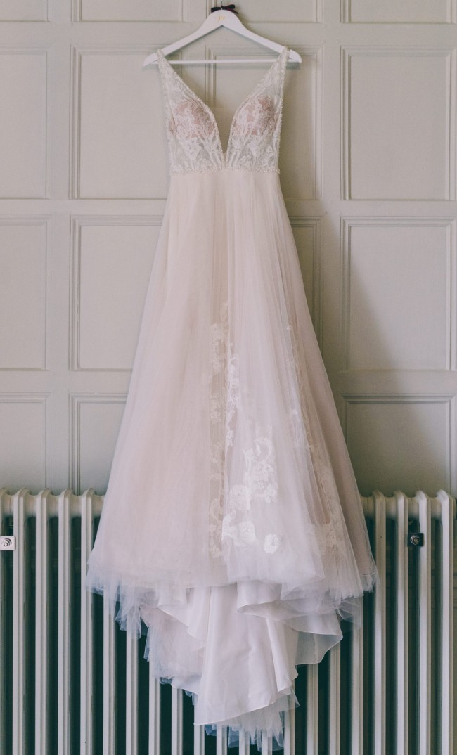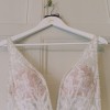 This dress has a lot of personality - romantic with beautiful lace detail throughout the light tulle layers of skirt and pearl detailing but also daring with plunging neckline and low backed lace bodice.