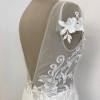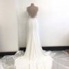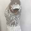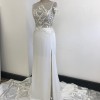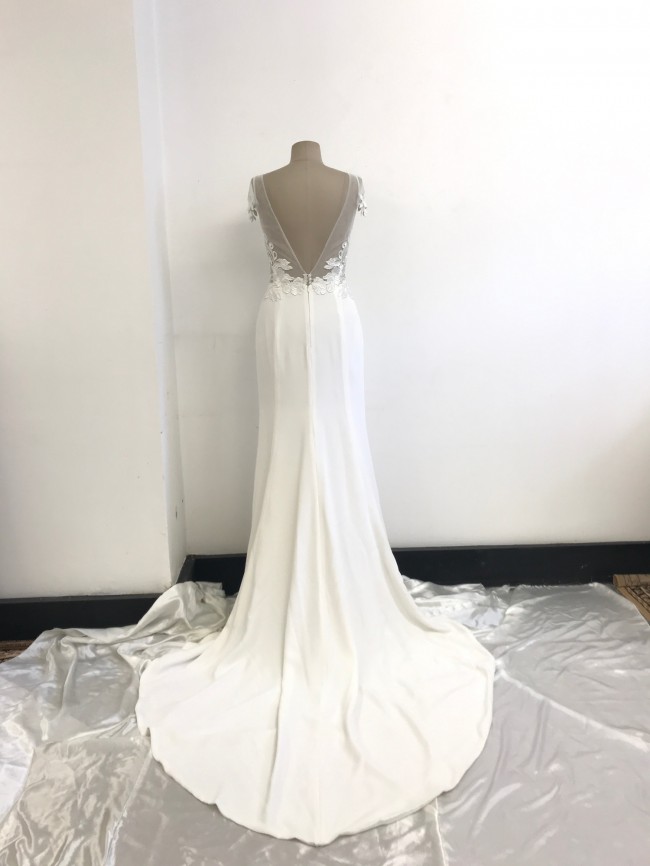 Brand new sample of the Montana gown from the new Mira Mandic collection. Elegant silhouette with modern details, this gown is very comfortable with beautiful movement through the skirt. The sheer bodice features hand-embroidered details which flow towards the backless design and below the waistline. The sleek skirt is styled in ivory matt satin with a side split and a romantic long train.