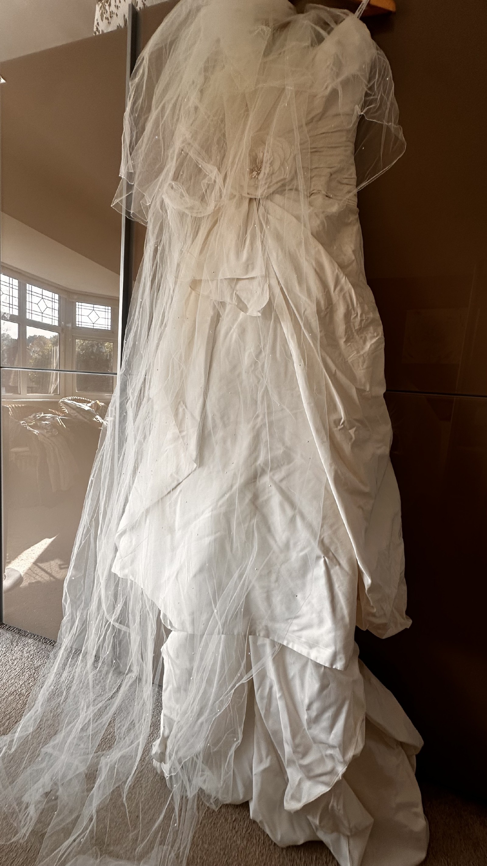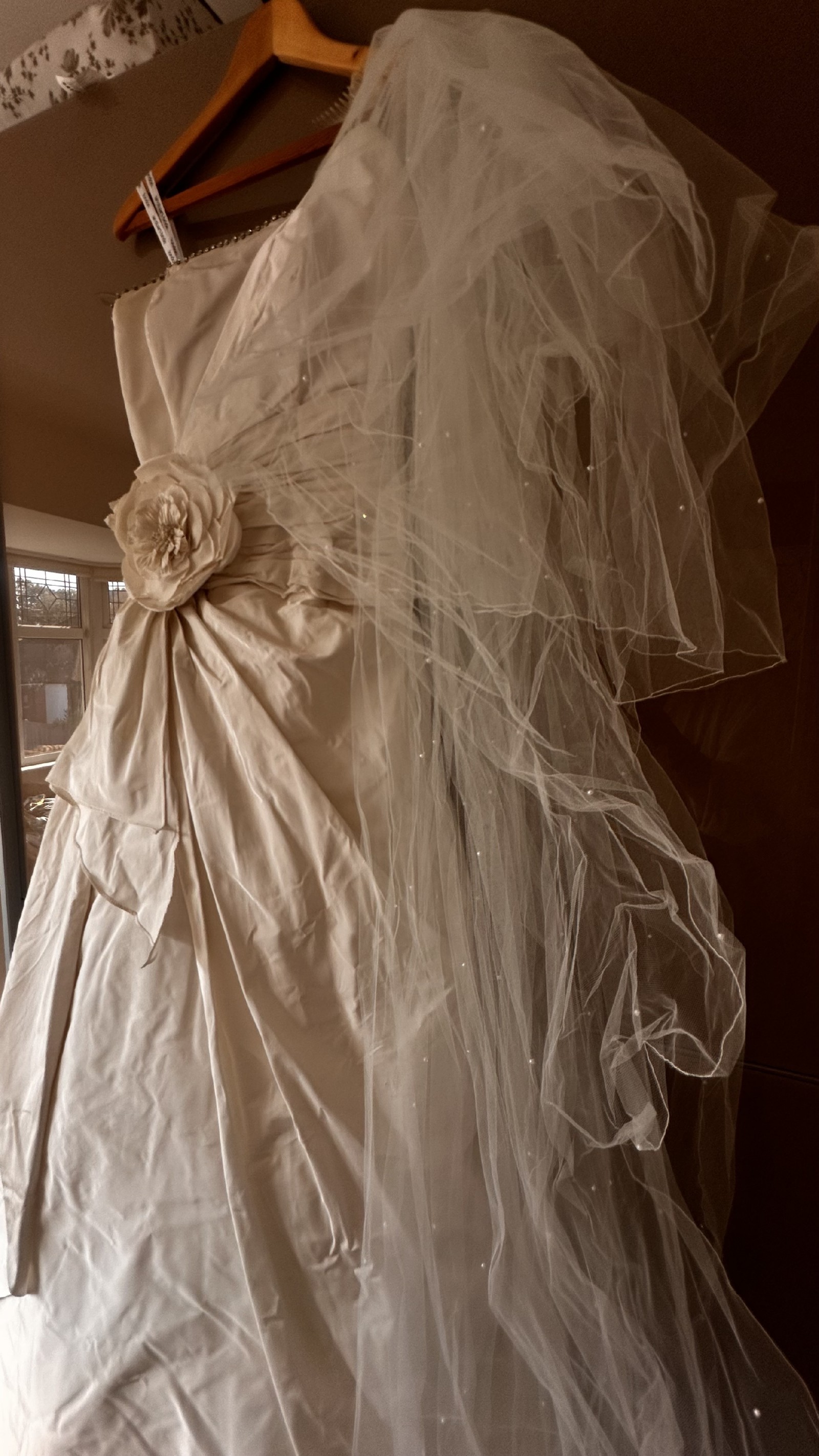 This stunning Ian Stuart ball gown has been a dream come true for my special day. Crafted from luxurious silk, its radiant ivory hue exudes elegance and timeless beauty, perfect for brides seeking a classic yet unforgettable look. The strapless neckline gracefully highlights the collarbone, while the low back adds a touch of allure and sophistication.