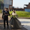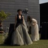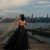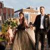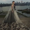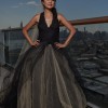 The iconic Josephine dress, named after Vera's daughter, is a v-neck halter ball gown with a low lace bodice and dramatic flowers at the neck. The gorgeous black multi-layered tulle skirt sits atop layers of champagne crinkled tulle. The exposed back is absolutely magnificent.