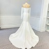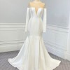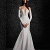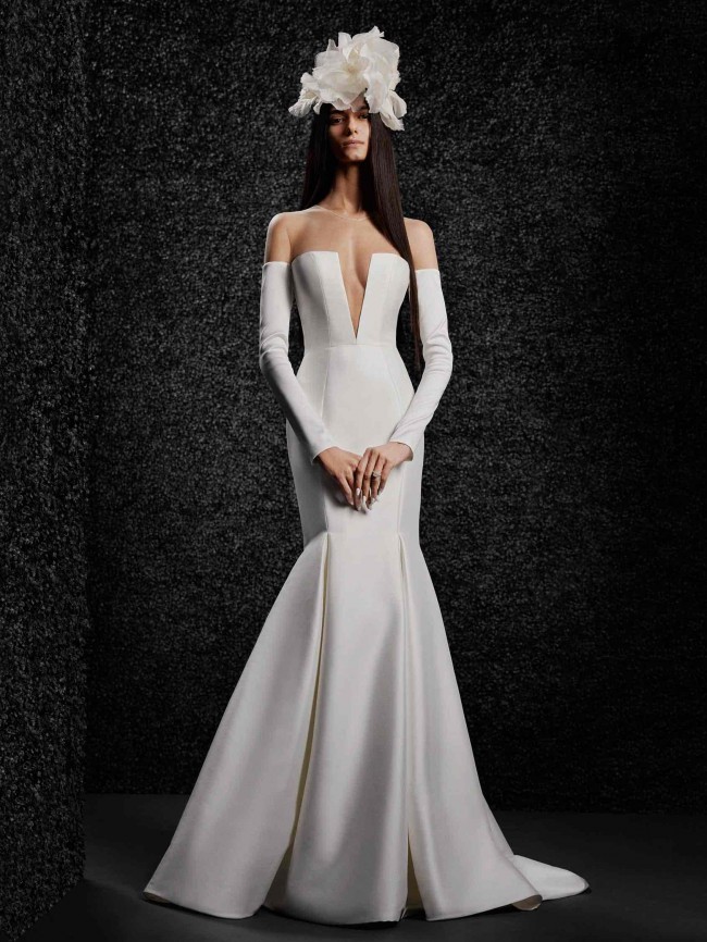 A smooth mermaid gown with dramatic features. A pointed plunge bodice anchors a fishtail skirt cut with box pleats for added volume. Glove sleeves and optional nude tulle yoke and back.