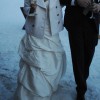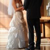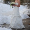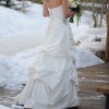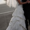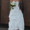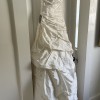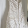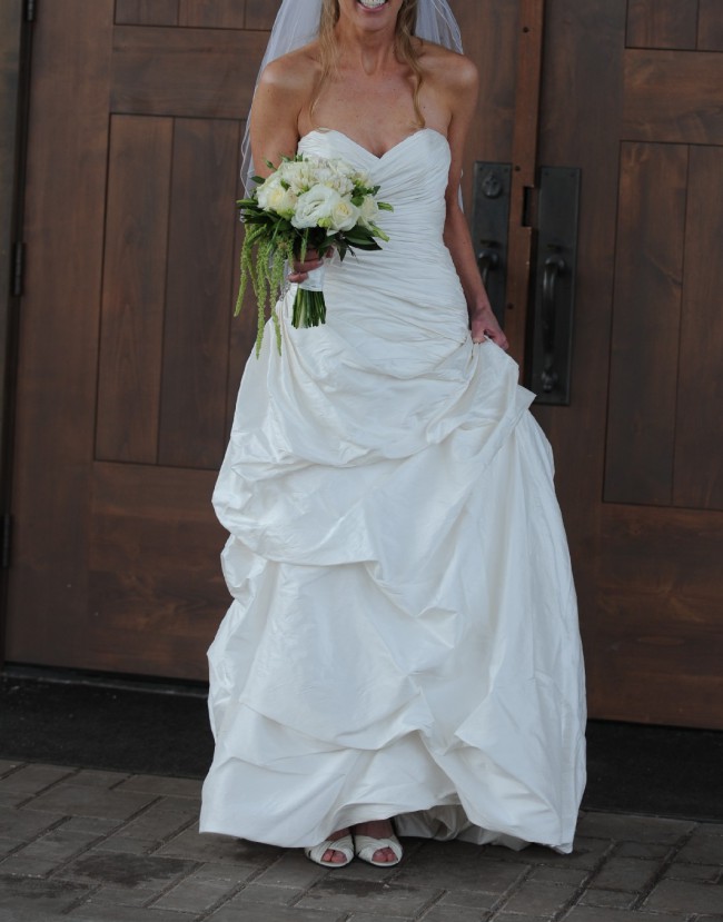 This dress is classically formal yet somehow modern and festive! It fit beautifully and was conformable to wear throughout the evening. The fabric is a gorgeous ivory silk shantung. Very classy. The details include ruching throughout that gathers with an appliqué. This makes it very flattering and it hides any 'imperfections'. The back has covered buttons running down the zipper which is my favorite detail!