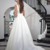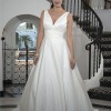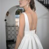 Sleeveless with plunged V neckline. Wide pleated band at waist, with pockets. Low square back with zipper and buttons. Sweep train.