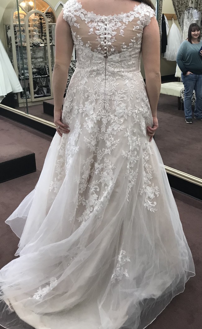 Beautiful ivory dress. Sheer front and back. Cap sleeves. Floor length, lace; Brand new never worn (except when tried on) dress bought in 2019. Comes with veil and belt.