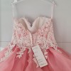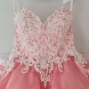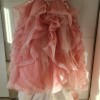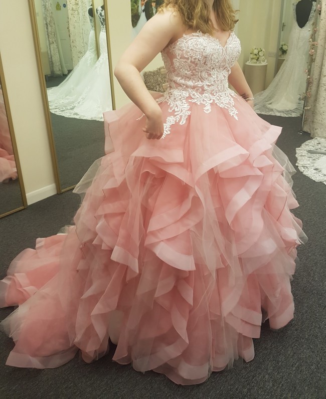 This dress is a beautiful dusty pink ruffle skirt ball gown with a sweetheart neckline and a laced bodice.