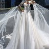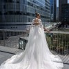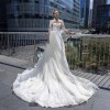 Beautiful cappuccino lace dress with sweetheart illusion neckline. An incredible train and unique “veil like” sleeves. The photos do not do the details of the dress justice. It's beautifully beaded which adds that bit of sparkle to the lace.