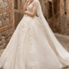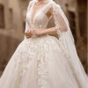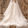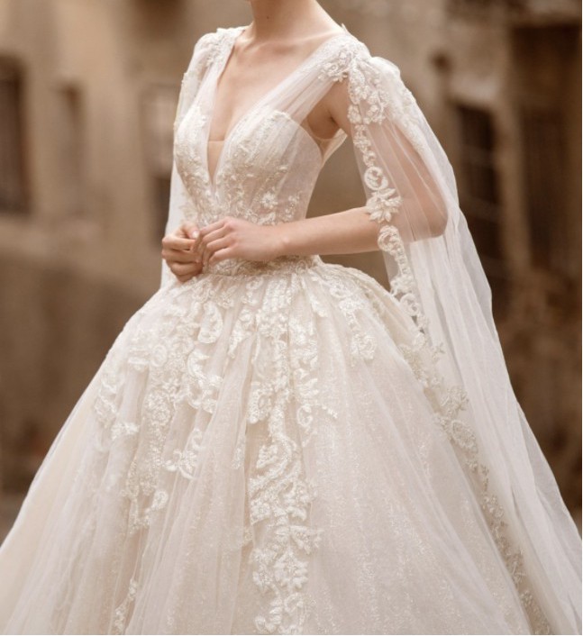 Sleeveless corset bodice with deep V-neckline and flowing tulle cape. Full skirt and cathedral train in layered sparkle tulle with leaf motif.