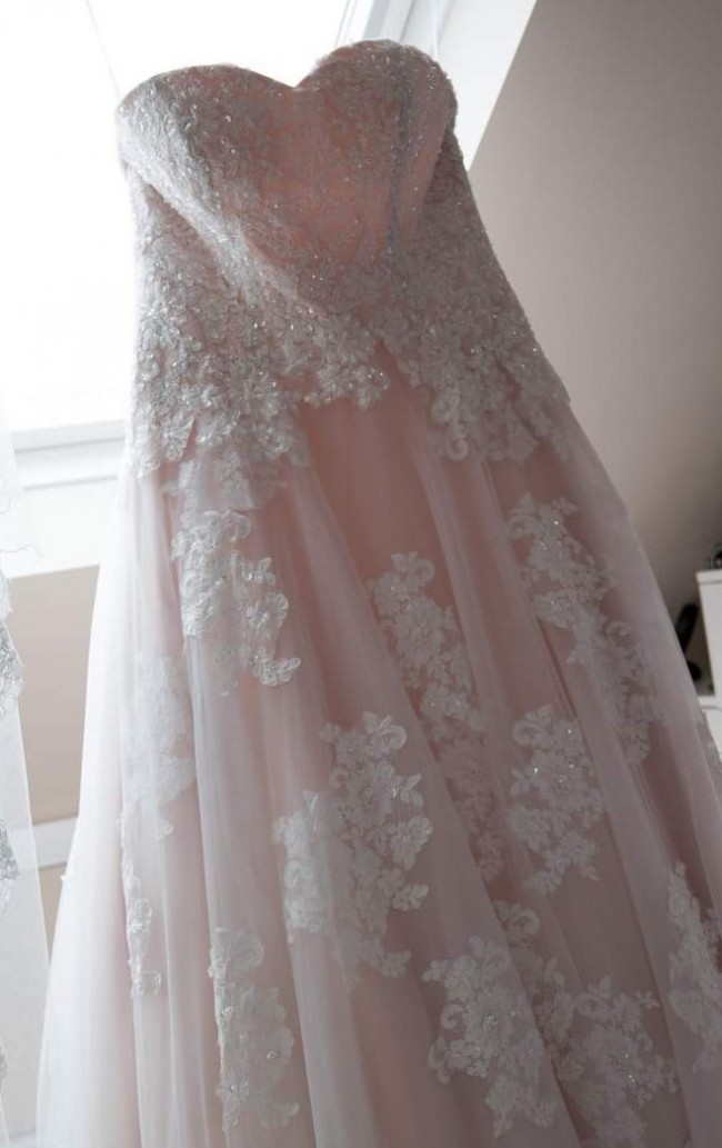 Beautiful Victoria Kay dressed worn in 2018 for a spring wedding. Very princess like and I never wanted to take it off. The blush pink underskirt is beautifully subtle and makes the dress something a bit different but still traditional. Very comfortable to wear. The train is edged with the same lace as the rest of the dress and the subtle sparkles make this dress eye catching. It doesn't deserve to be in a wardrobe!