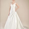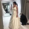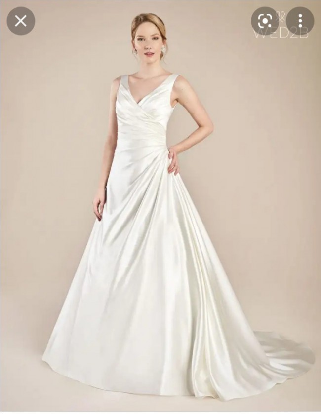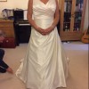 Beautiful satin wedding dress & hoop petticoat. Size 16, but closer to actual size 14. Available after February 14th. Optional Silk hook to lift train as needed. A few marks on bottom hem of dress; not dry cleaned.
