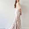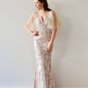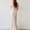 Description: Meet Georgia, our gorgeous namesake gown. She features plunging V-necklines front and back, paired with our Venice style skirt. Based on a mocha underlay, this gown is overlaid with Georgia lace on nude tulle. To top it off, Georgia has removable cape-like sleeves, with invisible press studs on the shoulder and armhole, and additional lace hand-placed at the head of each sleeve.