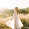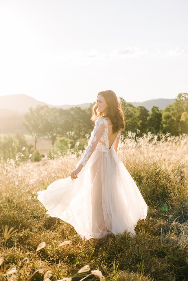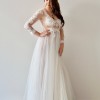 Description: A gorgeous long-sleeved off white tulle bodice, featuring V-necklines front and back, and overlaid with off white Grace lace. Like the Eastwood gown, the lace is embellished with silver and rose-gold seed beads, as well as hand cut lasercut flowers arranged sporadically on the bodice. A wispy tulle skirt is gathered with godets at the waist, and features a rose gold underlay.