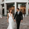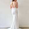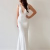 Description: Our Georgina gown has a plunging illusion V-neckline and a scooped U-shaped back of bodice. Paired with the Valentina skirt style, Georgina lace covers an off white moss crepe and power mesh lining. Embellished with Swarovski crystals and silver seed beads, she is sure to gleam under the lights.