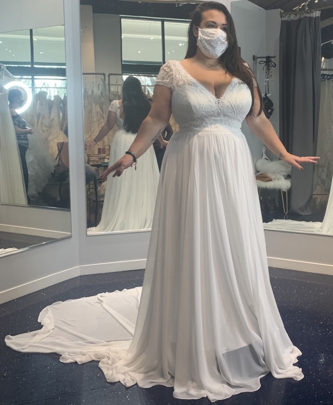 This dress is in brand new condition and was never altered. The only time it was worn was when it was being tried on in the photos, the very first time. I LOVED this dress, but my wedding was canceled as a result of COVID. As I never got to wear it for my special day, I'd love to see it go to someone who will cherish it.