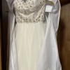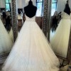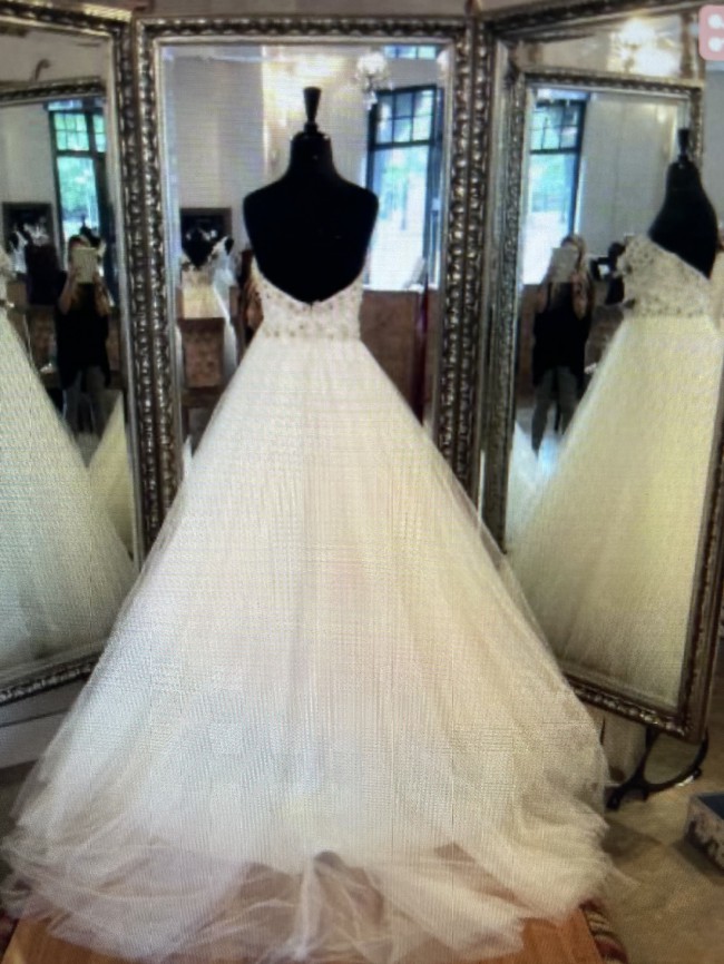 Ivory ballgown with sweetheart neckline and rhinestone bodice detail, purchased and worn in 2014, altered to fit 34B bust, 26 waist. I’m including both the chapel length and cathedral length veils w/ sale of the dress. The dress has a short train and bustles very nicely. I paid around 3200 for dress and veils.