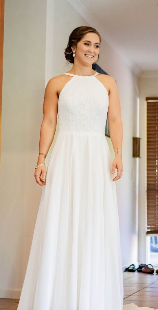 A perfectly simple wedding dress with stunning detail. This dress made me feel so elegant and beautiful on my wedding day.
