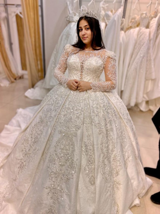 This is a one of a kind, head turning stunning wedding dress, every girls dream! It made me feel like a princess. Wearing it made me feel like I’m living the dream. It was very comfortable throughout the whole night and very easy to walk in . It was extremely shiny and I was glowing in it as it was filled with beautiful diamond like stones and pearls. It wasn’t over-exaggerated and it had just the perfect amount of everything on it. The dress also has a beautiful long train at the back which is extremely unique. The fitting was perfect and if you like to, you can loosen it out as much as you like or tighten it to your liking. It has the hoops circles imbedded in it.