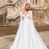 Take a trip into the 80s with this incredible A-line wedding gown. It is the long sleeves, with the puff shoulders, and that large bow at the back that make this dress truly amazing. The sweetheart neckline shows a little skin, but is there anything more alluring than the soft, silky fabric that makes up the design?