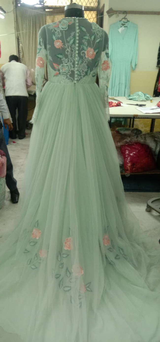 Tulle sheath gowns are cut to perfection, with cleverly positioned hand embroideries, strewn with Roses, Daisies, Forget me Nots, Cornflowers, Hummingbirds and Peacocks and are elegantly adorned with silk threads, ribbons, pearls, sequins and crystals.