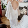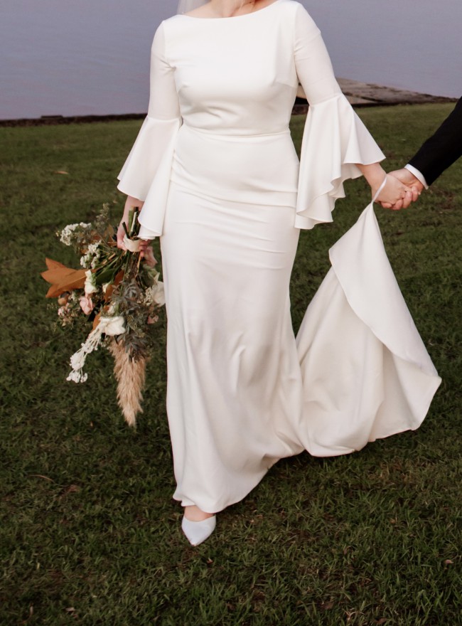 We had a winter wedding and this dress was perfect for it. It has been dry cleaned and is still in perfect condition. I absolutely love it, classic and classy. It is so comfortable to wear and certainly flattering in all the right places. I love the deep v back and the sleeves! Everyone comments on the sleeves, they hung beautifully.