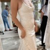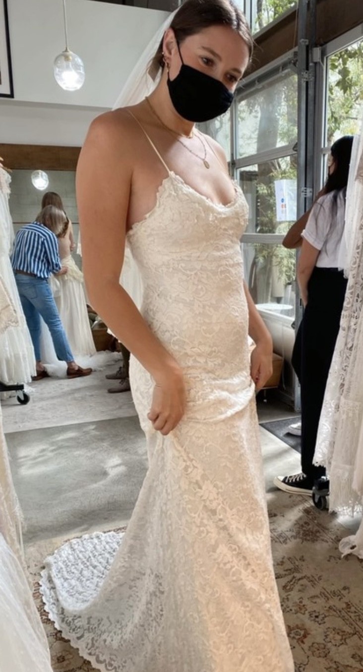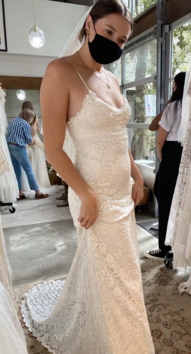Never worn!! I canceled my wedding, so as much as I LOVE this dress I was never able to wear it, aside from trying it on to purchase. This dress has beautiful lace details, simple spaghetti straps, and form-fitting but stretchy material that fits your body like a glove. I am 5'10 for length reference, this was easily long enough to wear with heels adding a few inches! Purchased at Grace Loves Lace in Los Angeles at the end of 2021 :)