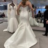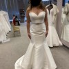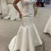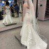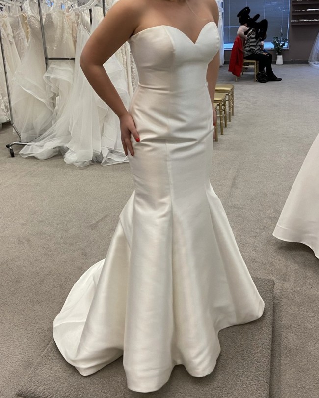 I bought this dress off the sample rack from Wendy's Bridal Columbus. It's a made out of beautiful mikado satin, so it has a bit of a sheen. It is missing 2 buttons in the middle of the back and the end of the train has some threads showing from wear of being tried on. The buttons can easily be replaced and the train will look new once it's hemmed. It is unaltered. It was never worn out of the store and has been dry cleaned. The belt has not been attached, so it can be worn with or without it. The belt is crystal and the brand is Essence of Australia.