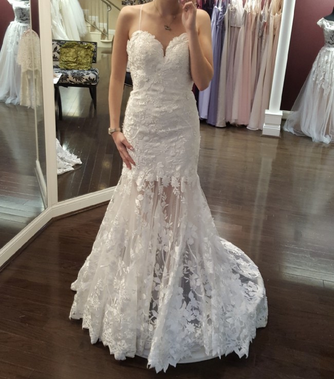 This is a one of a kind Barbara Kavchok designer gown from 2018. It has beautiful lace throughout with sheer lace from just above the knees to the floor. I truly love this dress and how unique yet classic it is. I purchased this dress in 2018 and never ended up wearing it so it is a new gown (never been worn except for trying the sample on in the store- see pictures). I hope that this gown goes to a good home with a bride who is as excited to wear it as I was!