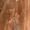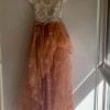 The sparkling beads in the bodice, and the detail in the orange skirt, make this gown unique. The neck line is asymmetrical at the front and the back. The skirt is short and asymmetrical at the front and flows along the floor at the back.