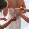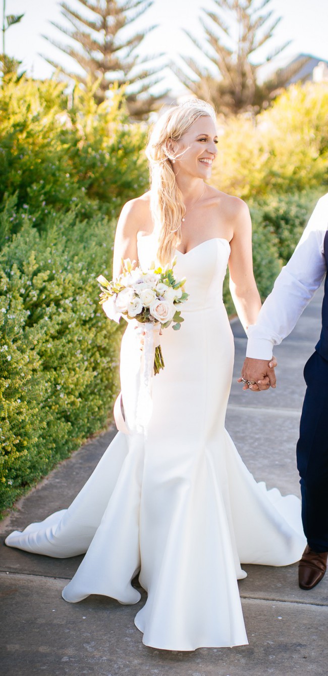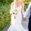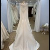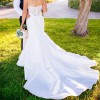 Timeless and elegant gown features ivory satin in a mermaid silhouette, strapless sweetheart neckline, elegant train and lace back detail with Swarovski crystals and pearls