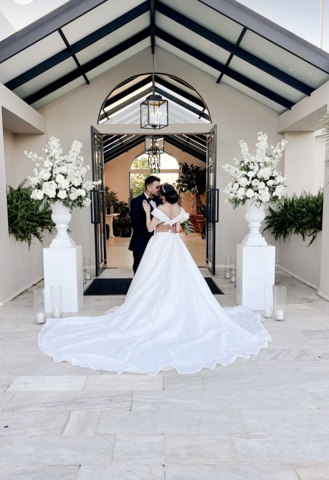 A dream wedding dress with a breathtaking cathedral train.