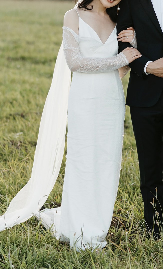Made from 2 layers of French crepe material, with french Chantilly lace overlay with an off shoulder sleeve.