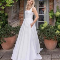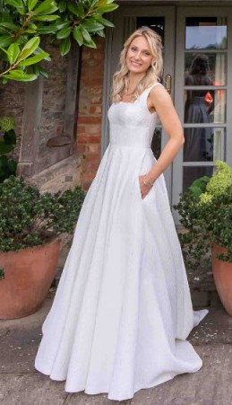 This is a beautiful modern A line dress in perfect condition. It has been dry cleaned and is ready to go. I felt like a princess in it, as it's a traditional but with modern twists. It didn't feel too big or puffy. The dress has a lot of texture and tonal flowers which gives it something really special. It's really flattering on the waist and you feel very secure in it as it has quite a corseted like structure.