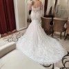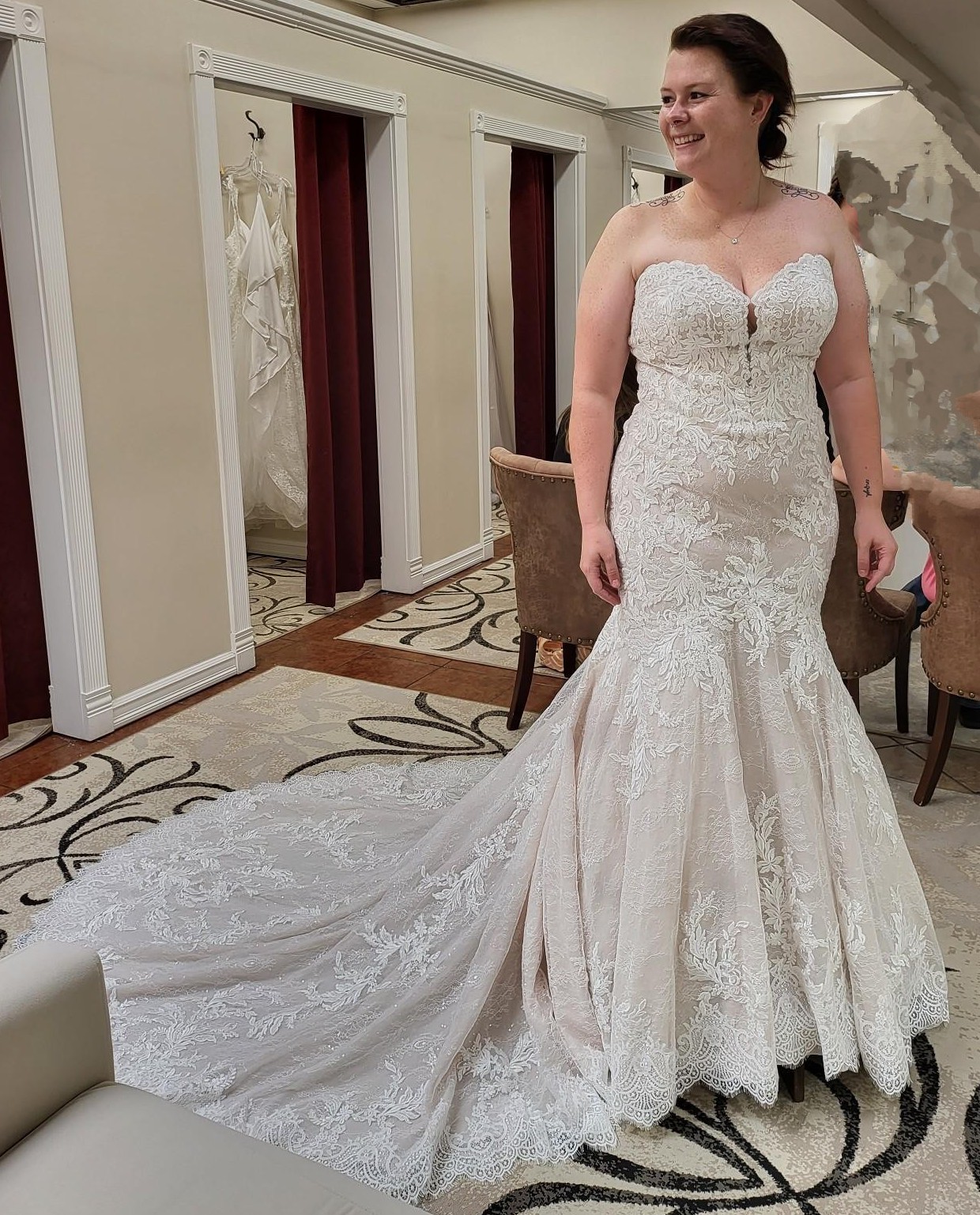 Dress has a sweetheart neckline and some sequins scattered over the dress. The buttons in back are able to be fastened and there is also a zipper. The back is sheer to the waist area. It has hooks for a bustle and was altered down to my size.