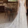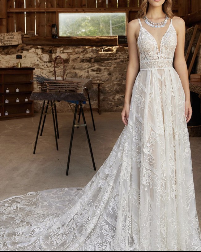 With exquisite lace details from top to bottom, a sexy spaghetti strap, and a dramatic voluminous train. Inez is both sultry and romantic.