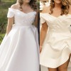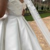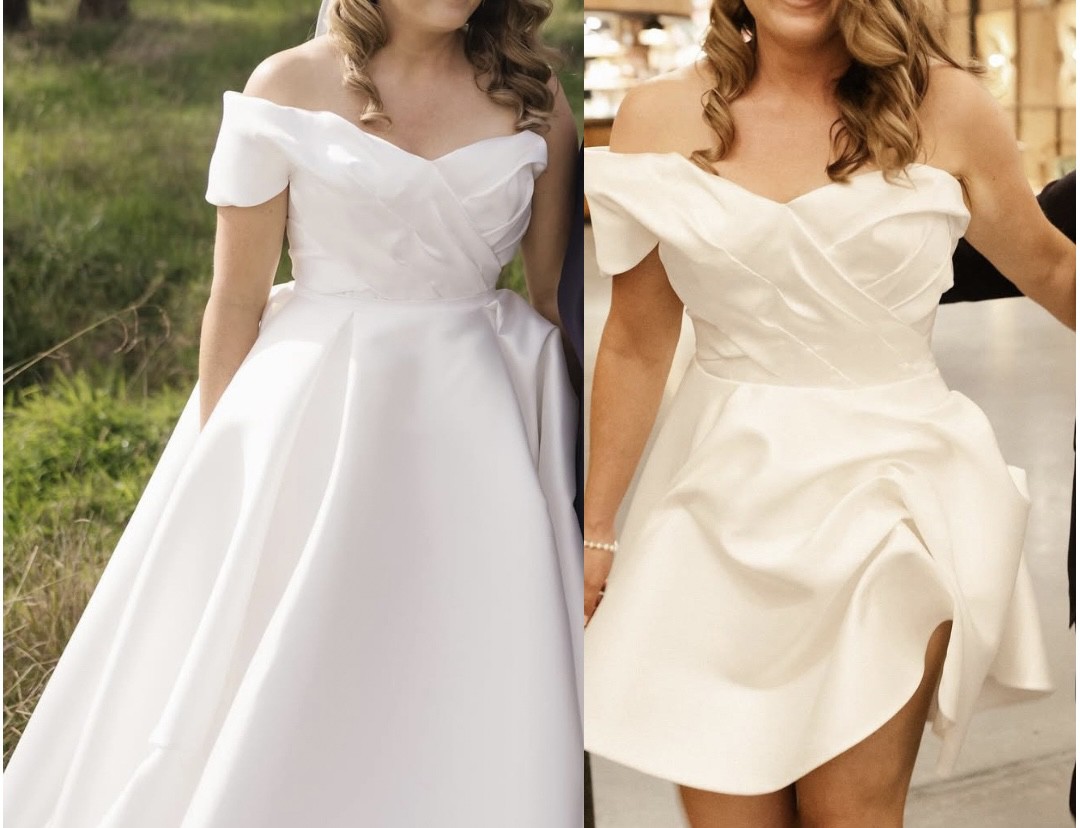 3 piece custom couture gown with short reception look. Bodice: hand draped, structured ivory silk mikado bodice with internal corset and bust support. Lace up back with internal buttons. Full skirt: full A line pleated skirt, 2.3 metre train. Hidden pockets. Party skirt: hand draped mikado satin mini skirt Veil: English tulle veil (long length) on comb with hand sewn flower details