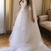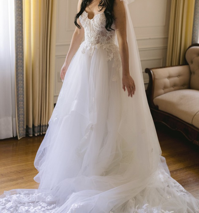 I fell love with this dress due to the sparkly details on the bodice and on the layered tulle skirt. It was just enough sparkle to make me feel like a true princess and did not overwhelm the look. I also found that that the layered tulle skirt on this dress was very unique compared to the other ballgown like dresses I had seen while bridal shopping.