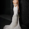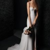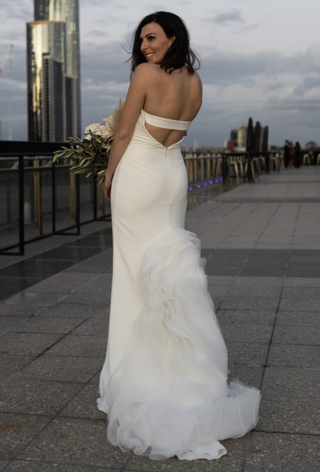 Crepe column gown with a structured bustier bodice and plunge back. A cascading bustle of soft ivory organza and tulle contrasts with the clean lines of the skirt. Also available without the front split.