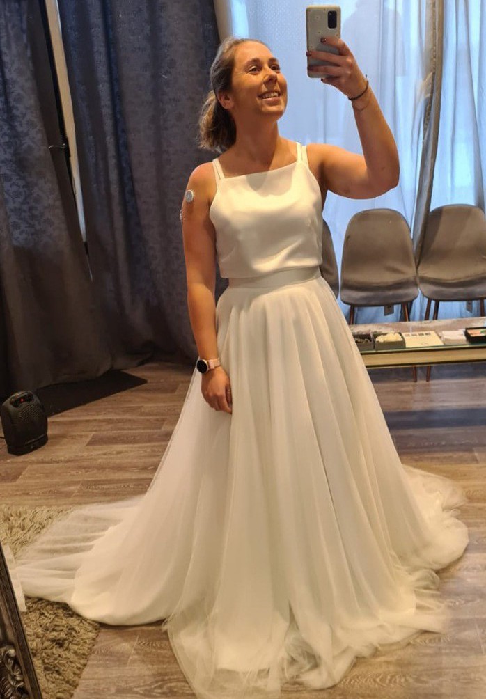 This outfit, from Rachel Burgess Bridal Boutique in Penarth, consists of an ex-sample bespoke hand sewn top, made by a beautiful Welsh designer, and a made to measure tulle skirt, also painstakingly made by a similarly stunning Welsh designer.