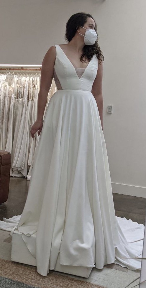 Beautiful and super comfortable dress. I loved it from the moment I tried it on. I felt very comfortable and beautiful in it. It even has pockets! The dress has been hemmed and a clip for the tail added so it is ready to go. I have a curvy body. This dress really accentuated my waist and it made me feel so beautiful. The fabric is soft and light. Aesling is a sustainable designer brand and the dress is made in Canada.