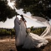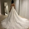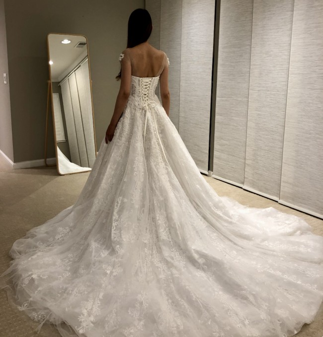 Gorgeous A line wedding dress with long train and dreamy layers. Corset back allows for this dress to be loosened or tightened to fit you like a glove! I tried on countless dresses across 8 bridal shops before deciding on this one that truly made me feel like a princess! Only sign of wear are a couple leaves that stuck to the bottom hem of inside layers of lace and tulle! You won’t regret choosing this dress for your big day!