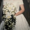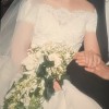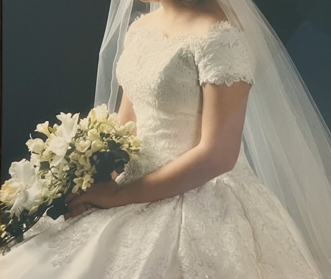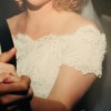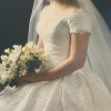 If you are a bride-to-be with a classic enduring appeal, this dress is an elegant dress with a timeless silhouette. It is a romantic off-the-shoulder A-line gown. The color is candlelight (between white and ivory) silk organza, subtle hand beaded with embroidered lace. The train length is considered chapel length. It is a classic gown with ethereal touches.