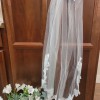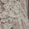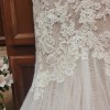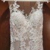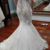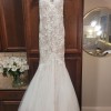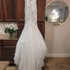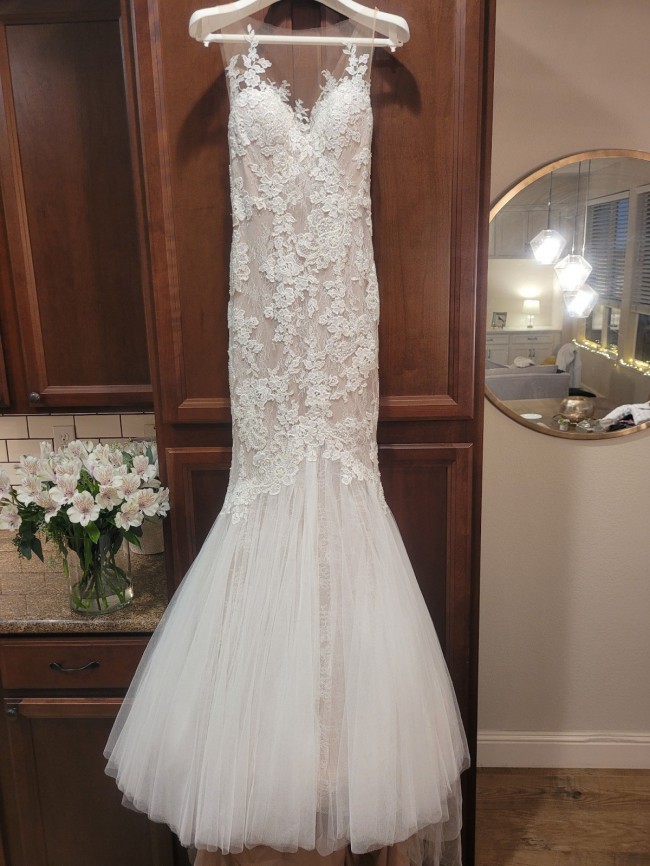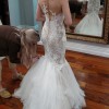 NEW- altered Mermaid lace with subtle pearl beading and beautiful illusion neckline. Very light and comfortable. Added French Bustle (seamstress shown buttoning bustle up in photo) that gracefully buttons to keep the mermaid silhouette for reception. Veil pictured included at no charge featuring matching lace. Unworn due to change of venue.