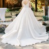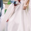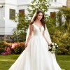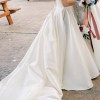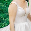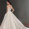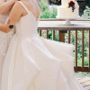 Martina Liana 981 is a classic and elegant wedding gown. A plunging neckline adorns the bodice of this simple ballgown, adding a hint of sexiness to this otherwise traditional gown. From the neckline, off-the-shoulder straps extend into a plunging V-back. At the waist, a full ballgown, complete with pockets, extends to the ground. The entire dress is made of ivory duchess silk satin – a medium weight, luxurious fabric with a beautiful pearly sheen and a matte back. This lovely fabric is easily recognized by the even, glossy surface and flowing drape. The back of this gown zips up beneath fabric-covered buttons that extend the length of the train.