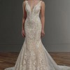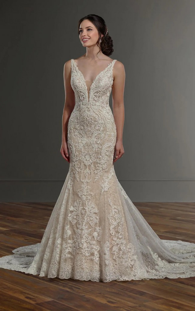 Martina Liana 1078 Size 10 - This gown is a beautiful beaded ivory lace over honey. It has a low neckline without being too revealing, an elegant low back, and a stunning lace train. This dress has never been worn, and still has the tags still attached. It was bought directly from a bridal boutique in Dallas, Texas. It has not been altered in any way, and has only been taken out of the bag once for inspection. It is in flawless condition, and a beautiful dress that needs to be worn. I am hoping someone is able to make good use of it!